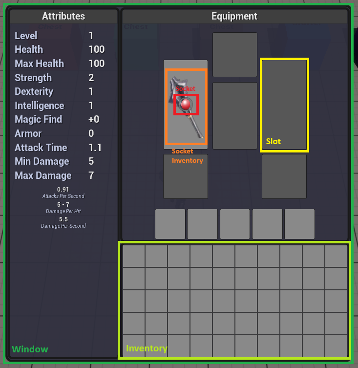 - Socket inventories (also known as equipment). These are also item stack widgets. Not all items can have sockets, but for simplicity they are all represented by a socket inventory widget.
